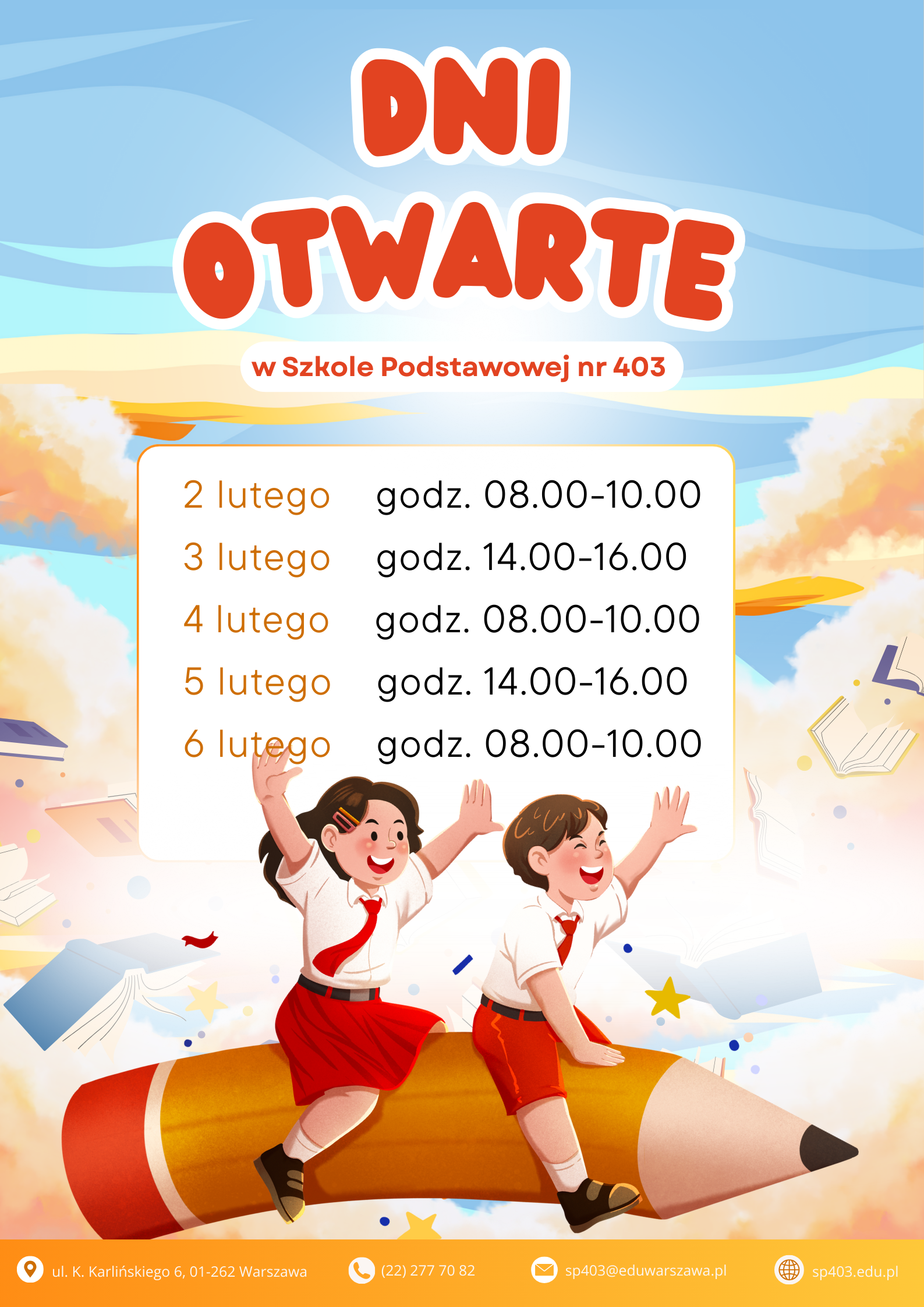 W dniach 2-6 lutego2026 r. zapraszamy na dni otwarte do naszej szkoły. W trakcie spotkań będzie można poznać szkołę, obejrzeć sale, porozmawiać z dyrektorem, nauczycielami oraz specjalistami.